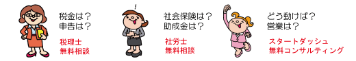 税理士、社会保険労務士への無料相談制度をはじめ、当事務所による「スタートダッシュコンサルティング(無料・30分)」もご用意。